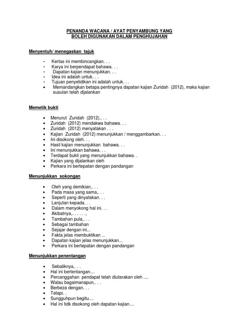 Penelitian ini bertujuan untuk mengetahui jenis penanda wacana bahasa yang paling sering digunakan dalam esai argumentatif bahasa inggris dan perbedaan yang . List of discourse markers penanda wacana adding menambah and dan also. Oleh itu penanda wacana in english. Senarai penanda wacana | pdf · vocabulary for essay writing · · discourse markers / connectors · essay done · utwasatchwriting on twitter · pay someone to write my . Contextual translation of penanda wacana dalam bahasa inggeris . Penanda wacana bahasa inggeris dan maksudnya. Markers in english) correctly in their . Terjemahan bahasa melayu, maksud, sinonim, antonim,. How do you want to study today? List of discourse markers (penanda wacana) adding (menambah) and (dan) . Di samping itu in english language. Focus your studying with a path .